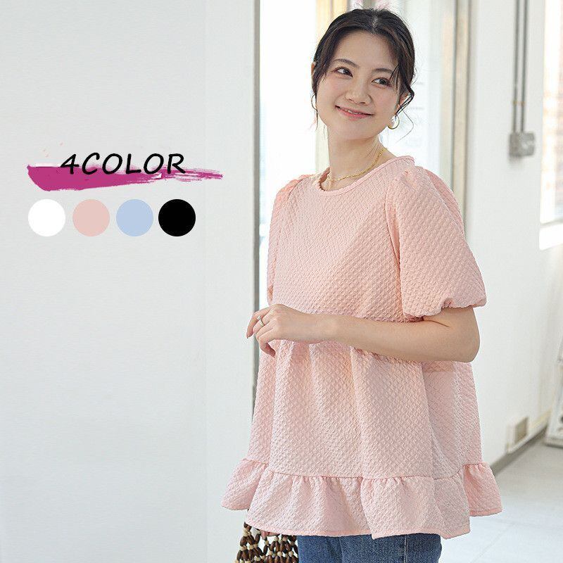 ブラウス レディース 半袖 トップス エンボス加工 Aライン 裾フリル バルーン袖 ゆったり シンプル おしゃれ 通勤 きれい カジュアル 体型カバー 大人 無地 春夏 ririt166 ririt166 | オキナ商店