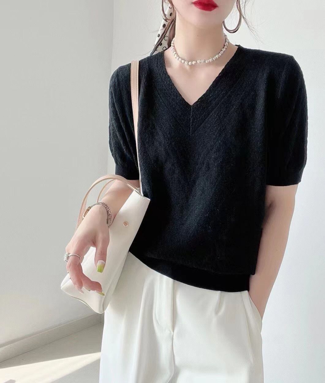 サマーニット 半袖 Tシャツ レディース ニットトップス パフスリーブ Vネック 五分袖 無地 トップス ニット 体型カバー 涼しい コーデ 夏 女性用 エレガント プルオーバー シンプル cbrd182 cbrd182 | オキナ商店
