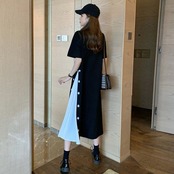 切替ワンピース 半袖 ボタン付 サイドプリーツ ロングTシャツ 大人 可愛い Tシャツワンピ Aライン ワンピース 春 夏 カジュアルanmeis01