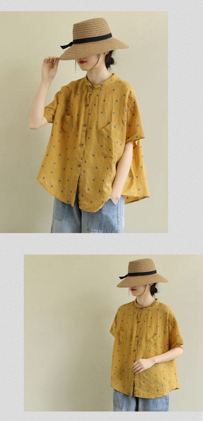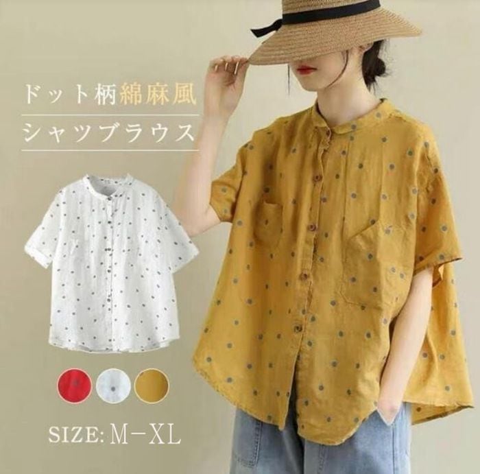 綿麻風 シャツ ブラウス 半袖 シャツブラウス レディース 大きいサイズ 体型カバー トップス おしゃれ 夏 森ガール シンプル ポケット付き ドット柄 可愛い 通勤 カジュアル ゆったり 薄手