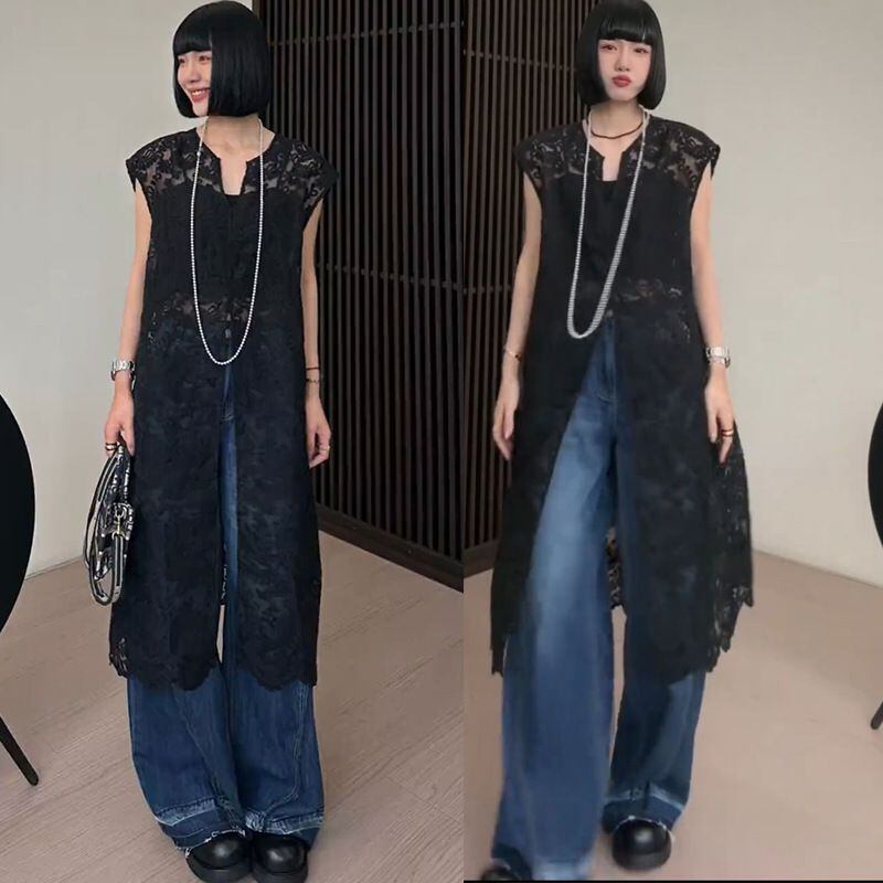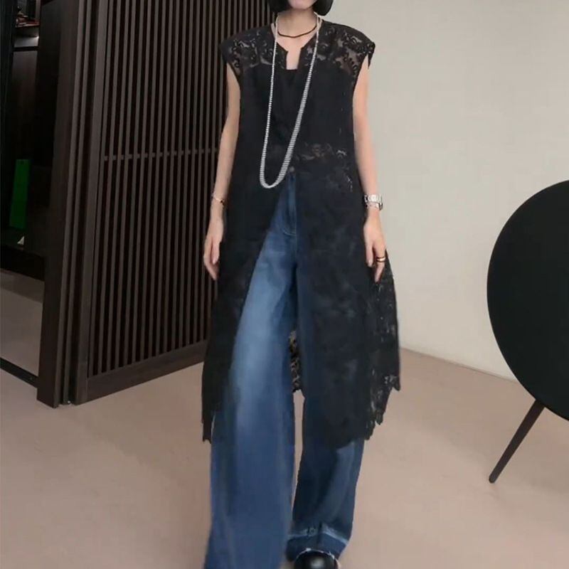 総レースベスト ロング丈 刺繍 上品 レディース 夏 vネック ベスト レディース 総レース ロングベスト 透け感 シースルー トップス ロング ノースリーブ 羽織り 重ね着 レイヤード 上品 エレガント フェミニン おしゃれ chenbao01 | オキナ商店