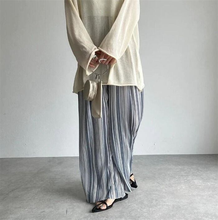 ワイドパンツ 春夏 プリーツパンツ レディース ストライプパンツ 涼感 プリーツワイドパンツ ロングパンツ 配色 ボトムス ウエストゴム 冷感素材 カジュアル 涼しい 爽やか 薄手 シンプル 大きいサイズ 着痩せ ゆったり 美脚shiyiyuan01 | オキナ商店