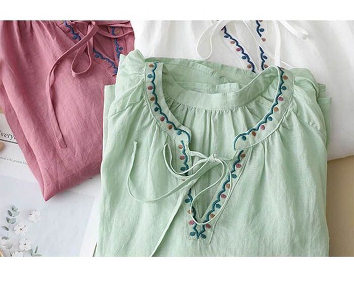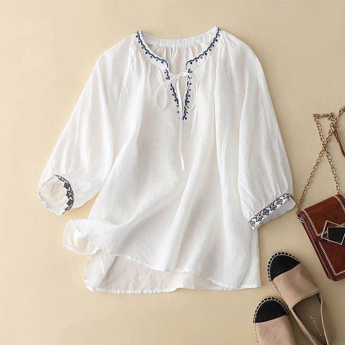 tシャツ レディース 刺繍 ブラウス 春夏 七分袖 vネック 綿麻風 プルオーバー デザイン カットソー Tシャツ トップス 7分袖 チュニック ぽわん袖 ゆったり 透け 爽やか 大人 かわいい ナチュラルmina01 | オキナ商店