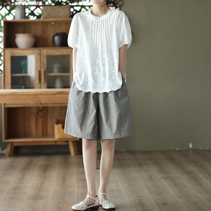 ブラウス クルーネック シャツブラウス レディース 半袖 プルオーバー ブラウス バックボタン コットンレース ゆったり タック入り 大きいサイズ 花刺繍 薄手 綿 日焼け止め トップス コットン 体型カバー 可愛い jueli01 | オキナ商店