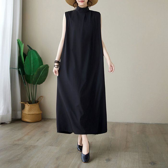 ノースリーブ ワンピース ハイネック レディース 春夏 ロング Aライン ハイネックワンピース ノースリーブワンピース ロング マキシ丈 シャツワンピース シャツワンピ ゆったり 大きいサイズ 体型カバー 黒 ブラック 袖なし qiyilian01