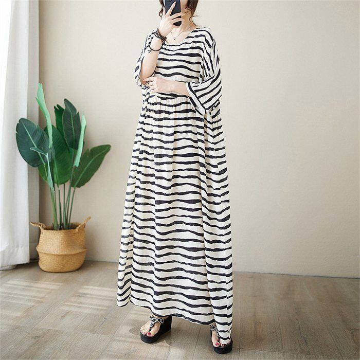 ワンピース 半袖 夏 ボーダー ロングワンピース マキシワンピース レディース リゾートワンピース 大きいサイズ マキシ丈 ワンピ 綿麻風 ボーダーワンピース 五分袖 半袖 大きいサイズ ゆったり 体型カバーaimei04 | オキナ商店