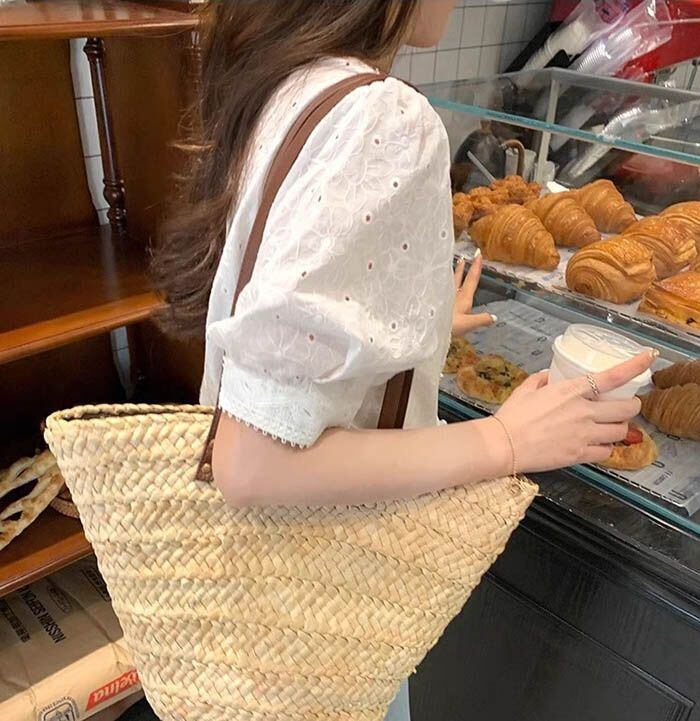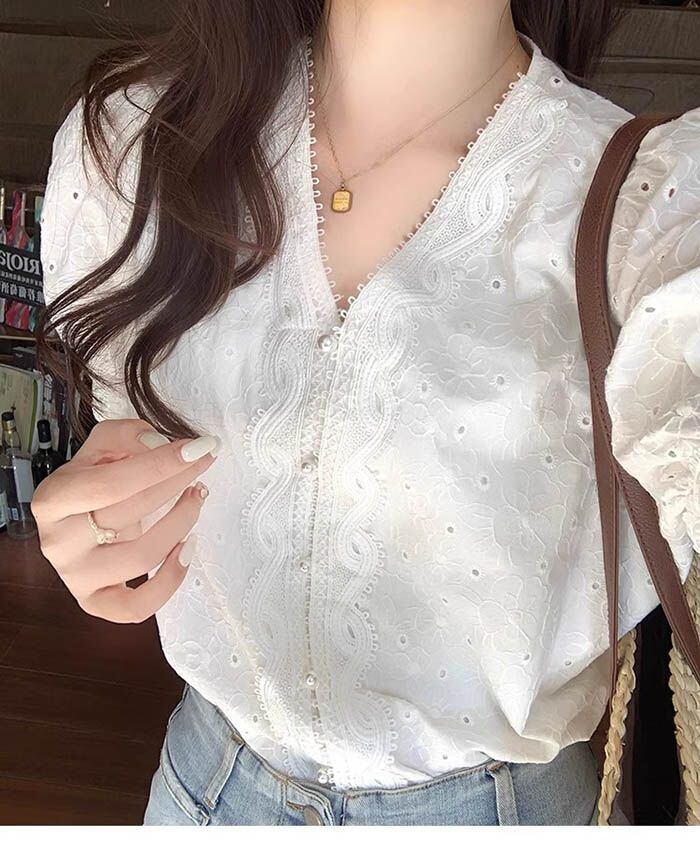 ブラウス レディース レース 刺繍 半袖 vネック シャツブラウス トップス パフスリーブ ショート丈 白ブラウス 夏 カジュアル 大人 可愛い おしゃれ キレイめ エレガント シンプル フェミニン 着回し