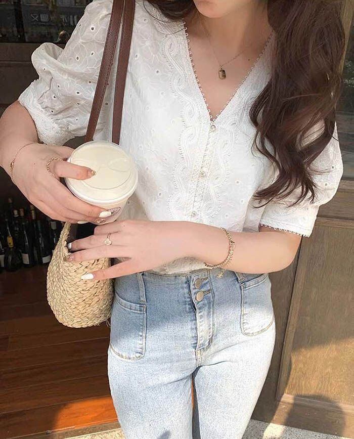 ブラウス レディース レース 刺繍 半袖 vネック シャツブラウス トップス パフスリーブ ショート丈 白ブラウス 夏 カジュアル 大人 可愛い おしゃれ キレイめ エレガント シンプル フェミニン 着回し youxp01 | オキナ商店