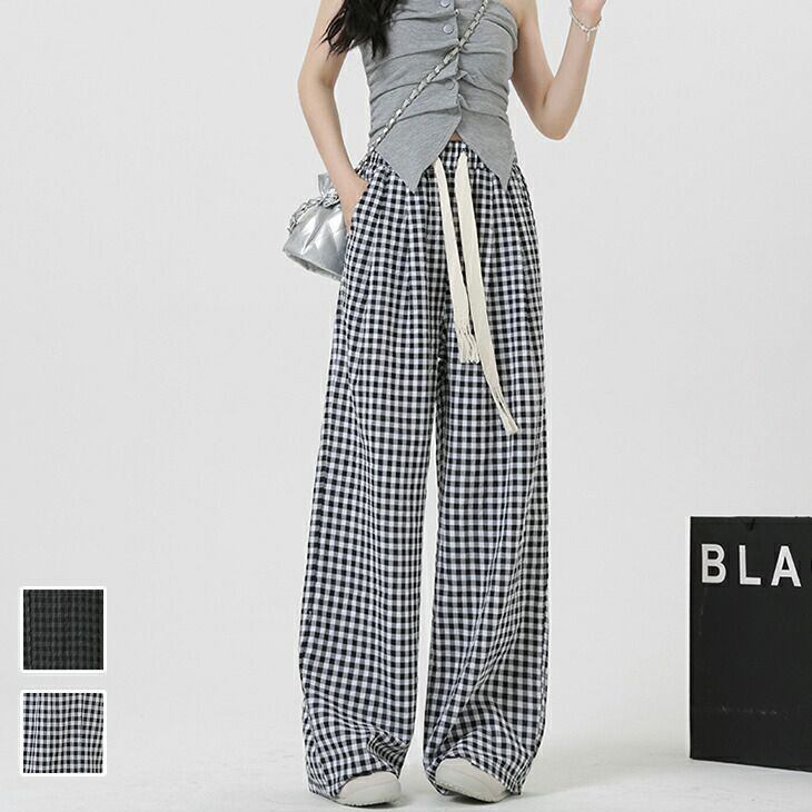 チェック柄 ワイドパンツ ロング チェック カジュアル 脚長 ウエストゴム ゆったり 伸びる 伸縮性 グレー ブラック 灰色 黒 春 夏 レディースファッション 20代 30代 40代 50代 60代