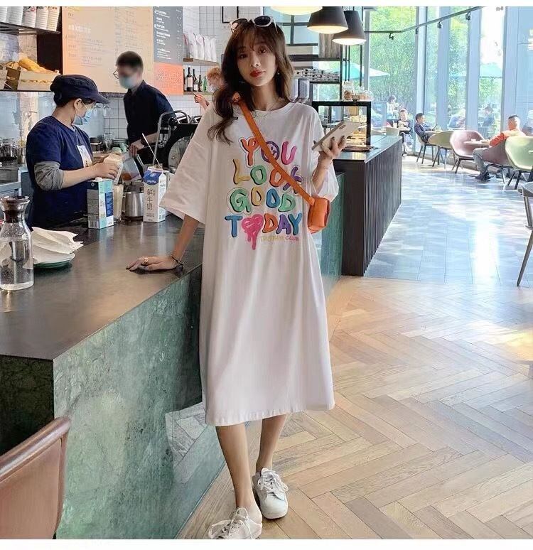 英字プリント Tシャツワンピ ロングワンピース 半袖 レディース クルーネック ワンピース 夏 ロング丈 マキシワンピース スリット入り カジュアル 体型カバー 着痩せ マタニティ ゆったり 肌触り 柔らかい 楽ちん jixi20 | オキナ商店