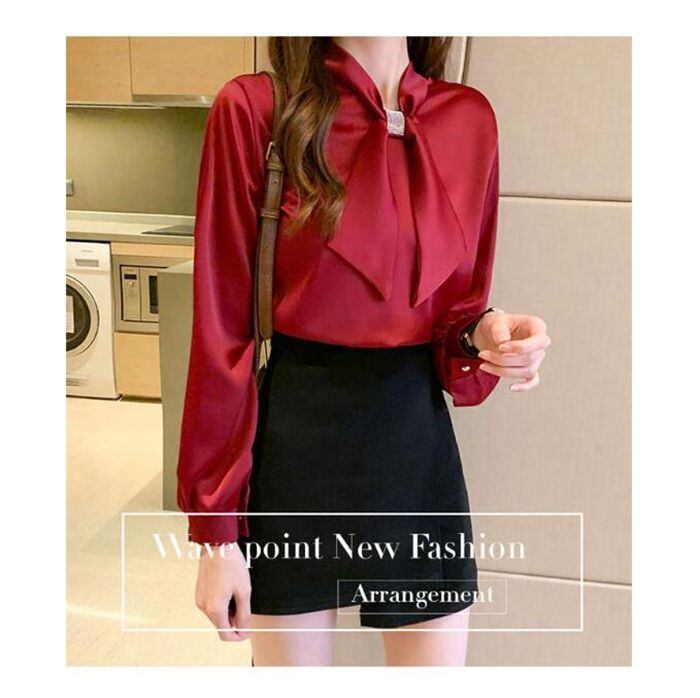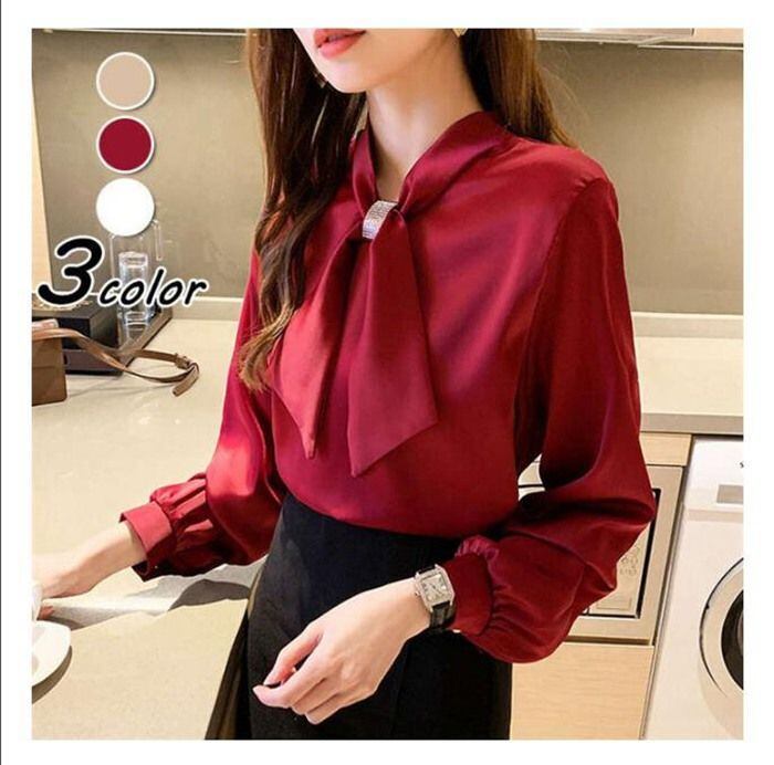 ブラウス レディース きれいめ 40代 春秋新作 オシャレブラウス シルク風シャツ 長袖トップス リボンVネックブラウス 大人 通勤 ゆったり シャツ30代 50代 ホワイト ベージュ レッド xzxiaoyun288 | オキナ商店