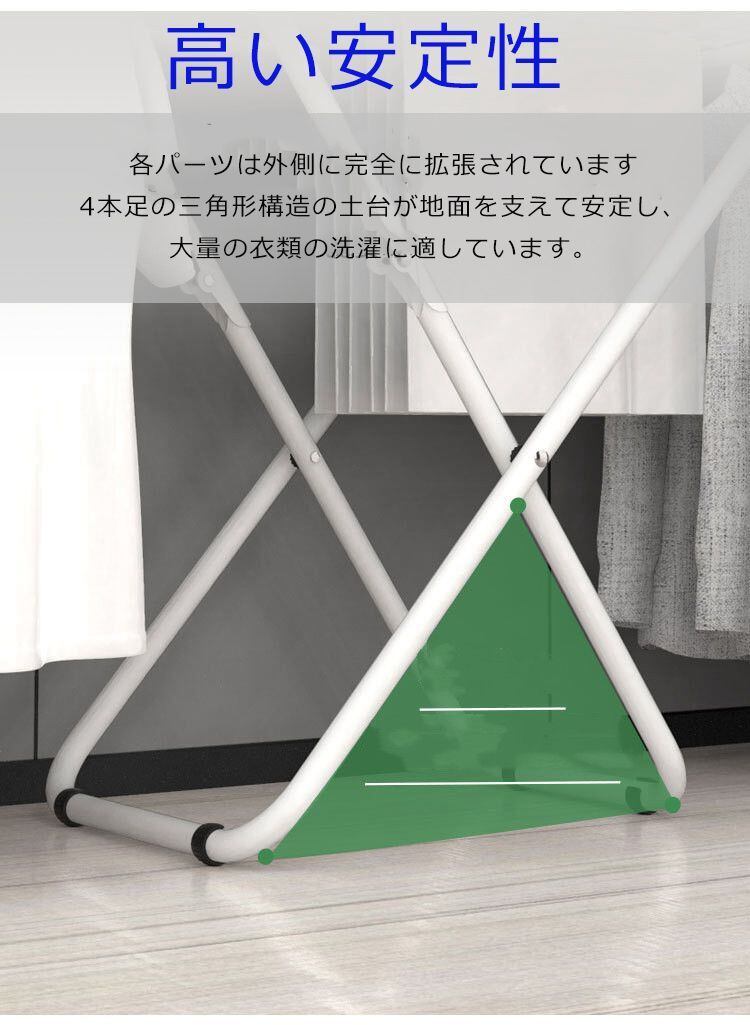 高い安定性:安定性が高い物干しラックです。各パーツは外側に完全に拡張されています。4本足の三角形構造の土台が地面を支えて安定し、大量の衣類の洗濯に適しています。