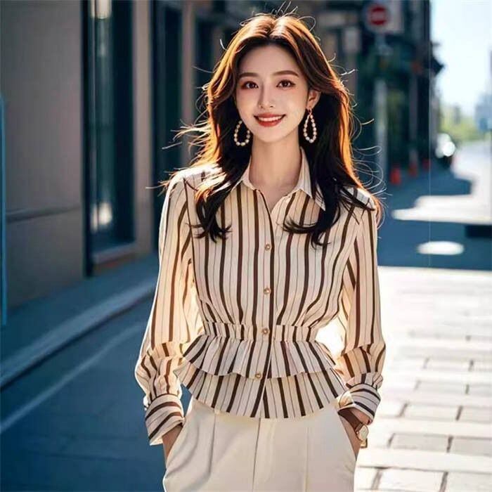 シャツブラウス ストライプシャツ レディース トップス 春 ブラウス シャツ ストライプ柄 デザインシャツ 着痩せ 長袖 ショート丈 春夏秋 大きいサイズ 大人 可愛い お洒落 通勤 オフィス OL 体型カバー フォーマル カジュアル OLxzzhang187