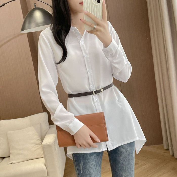 シャツ レディース 長袖 ロング チュニック ロングシャツ 春 夏 秋 冬 ワイシャツ 襟付き aライン 大きいサイズ ゆったり 透け感 重ね着 オーバーサイズ フォーマル オフィス カジュアル ビジネス 大人 OL yilian20 | オキナ商店