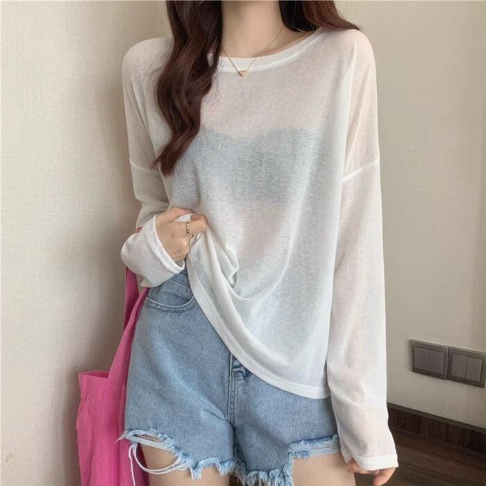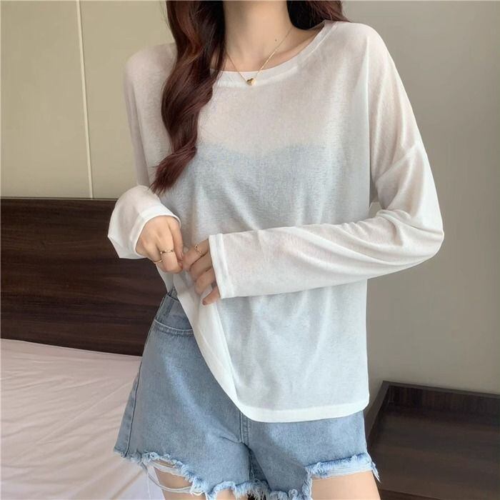 シアートップス レイヤード シースルー トップス tシャツ 長袖 重ね着 Uネック インナー 白 無地 体型カバー シアーtシャツ シースルー トップス UV 紫外線対応masigao01 | オキナ商店