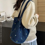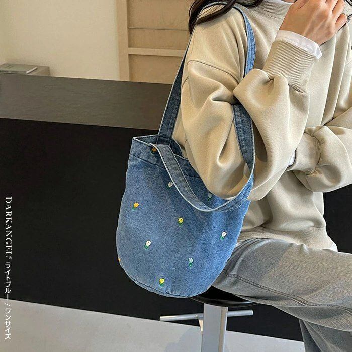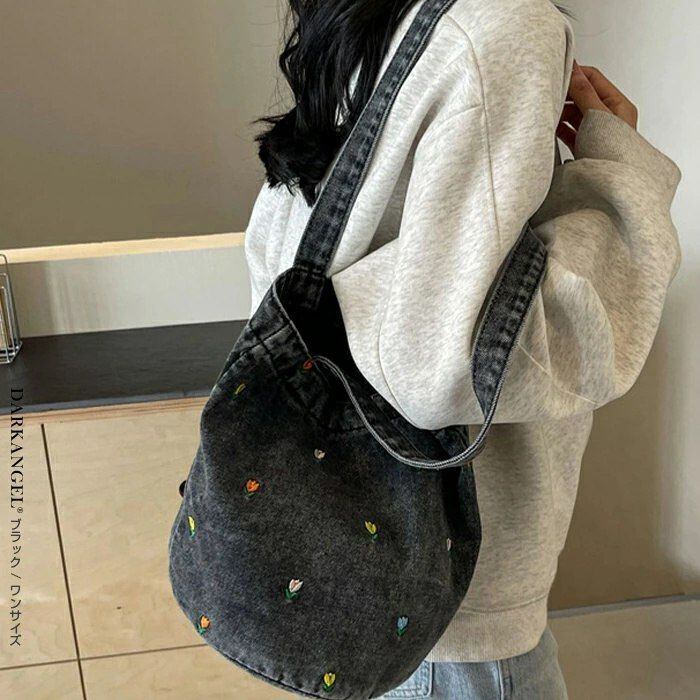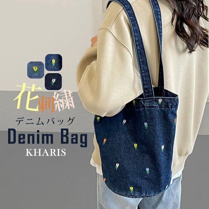 デニムバッグ レディース トートバッグ 花柄 刺繍 バケツバッグ 大きめ 肩掛け 大容量 手提げ バッグ マグネット 軽量 通学 通勤 普段用 シンプル ブルー ブラック\nhyxz09 | オキナ商店