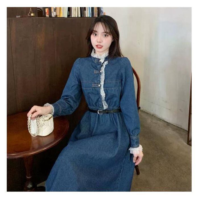 デニムワンピース ワンピース デニムロングワンピ 春ワンピース ロング丈 マキシ丈 Aライン ロングワンピ ベルト付き 長袖 上品 無地 レース 着痩せ エレガント きれいめ 春秋 体型カバー お洒落 カジュアル デート 大人 xzxiaoyun262 | オキナ商店