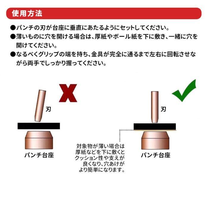 【適用範囲】革製品・布製品・書類・ビニールシート・ゴム板など、ホビー・レザークラフト・裁縫など服飾関係に正確な穴あけができる。