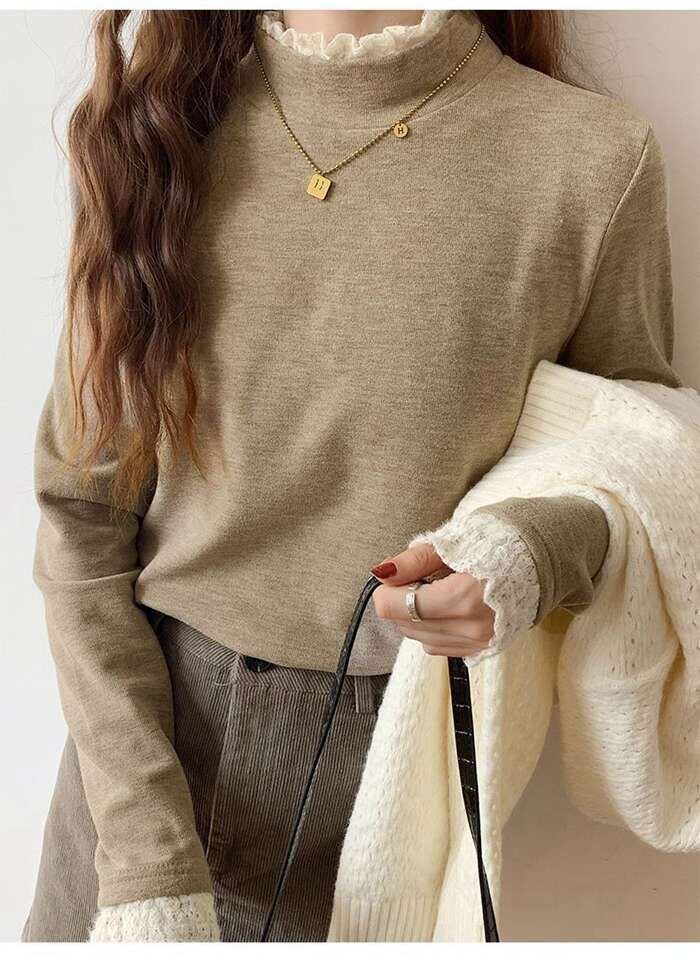 カットソー 重ね着風 トップス 全3色 ハイネック レース フリル 長袖 レディース ナチュラル タートルネック ハーフネック ロンT インナー 薄手 柔らかい 伸縮性 ストレッチ シンプル 大人qiaofu01 | オキナ商店