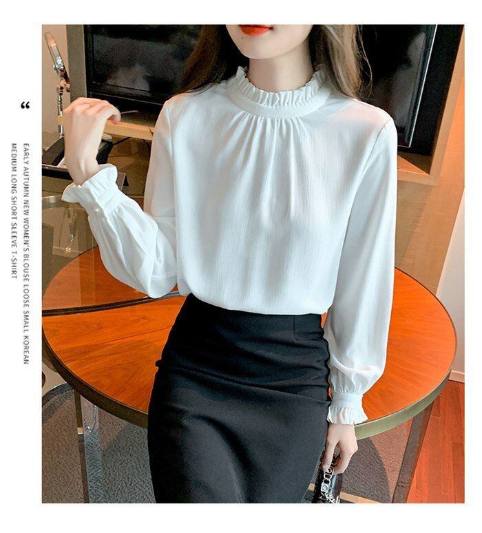 ブラウス レディース 立襟 フリル 長袖 シフォン シャツ トップス タック エレガント 女性らしい 魅力 おしゃれ かわいい オフィス 大人 体型カバー 細見え 通勤 春秋 yimei11