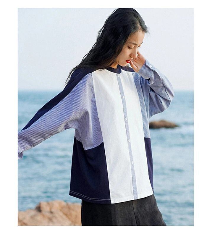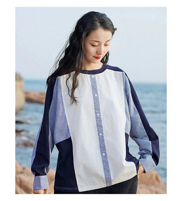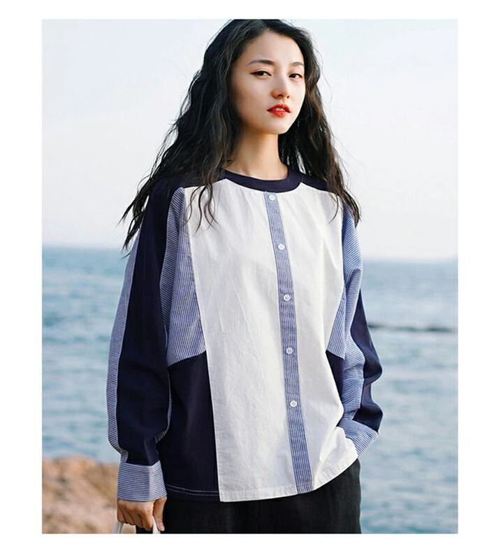 シャツ レディース おしゃれ プルオーバー ブラウス 長袖 ストライプ シャツブラウス 柄 切り替え 長袖シャツ おしゃれ クルーネック 綿混紡 ゆったり 体型カバー 着痩せ 着回し Tシャツ xiaokb211 | オキナ商店