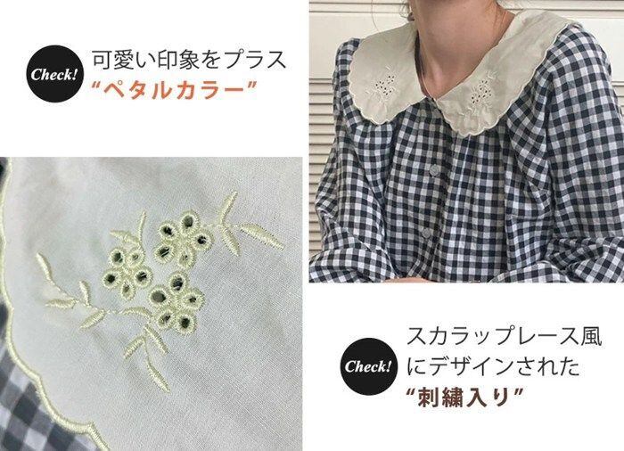 ブラウス レディース 長袖 ギンガムチェック 柄 丸首 ペタルカラー 襟 おしゃれ かわいい きれいめ 大人 ママコーデ 春秋 ゆったり トップス シャツ 薄手 フロントボタン パフスリーブ ワンポイント 刺繍 シンプル カジュアル 普段着