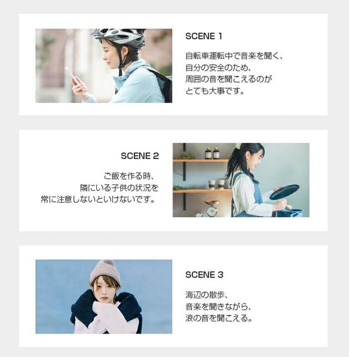 どんな耳の形にもフィットするイヤーカフ構造の骨伝導イヤホンは、一般の耳かけ式と違って、耳介に挟むように装着します。イヤホンが入りにくい耳穴でも問題なし!骨伝導イヤホンは耳をふさがないので、テレワーク?スポーツ?移動中など、全ての場面でながら聴きしながら作業可能です。また、左右完全分離に進化しました。煩わしいネックバンドなどを気にすることなくどんなヘアスタイルでも快適に装着いただけます。