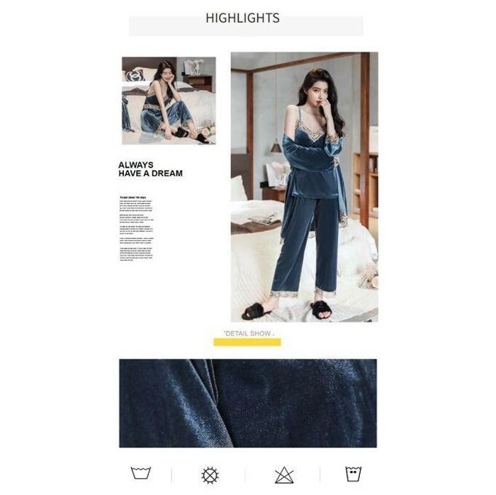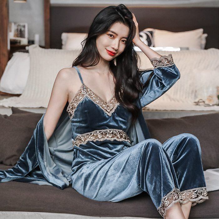 セクシー ルームウェア レディース パジャマ 秋 冬 セットアップ 3点セット キャミソール パンツ コート 長袖 ゆったり ベロア 羽織 レース 花柄 部屋着 可愛い おしゃれ カジュアル Vネック ギフト プレゼント xzxiaoyun219 | オキナ商店