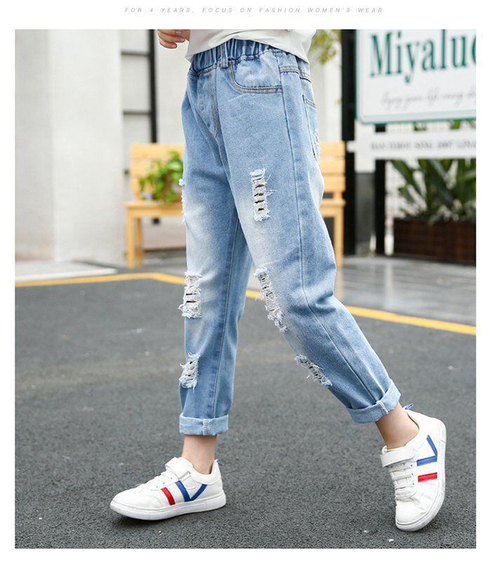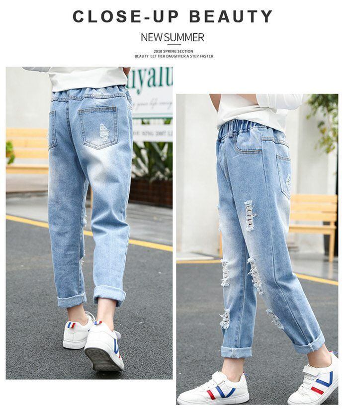 デニム ダメージジーンズ 女の子 ジーンズ 夏 子供服 おしゃれ シンプル パンツ 子供 学生 ロングパンツ ジーパン キッズ ボトムス ダンス ジュニア 韓国ファッション ウエストゴム mkxz305 | オキナ商店