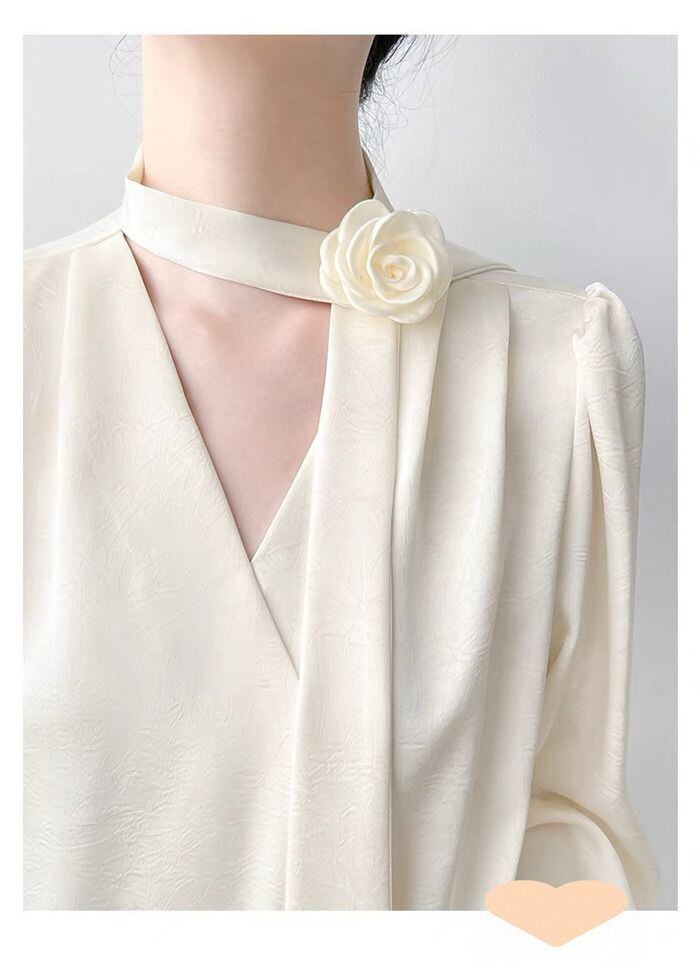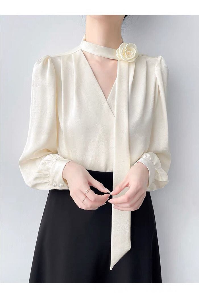 ブラウス レディース vネック フォーマル 長袖 春 秋 薔薇 ストール リボン オフィス シャツ スーツ インナー トップス セレモニー 大人 カジュアル 無地 ビジネス 通勤 卒園式 入園式 入学式 卒業式 mkxz313 | オキナ商店