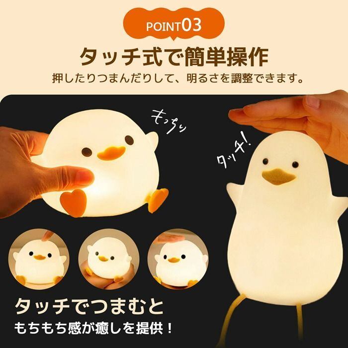 スイッチ付きの面白いアヒル常夜灯。キッズランプは3度の明るさで、まず、下の電源ボタンを押して電源を入れます。次に、アヒルの常夜灯をこねて、30分のタイマーをオンまたはオフにします