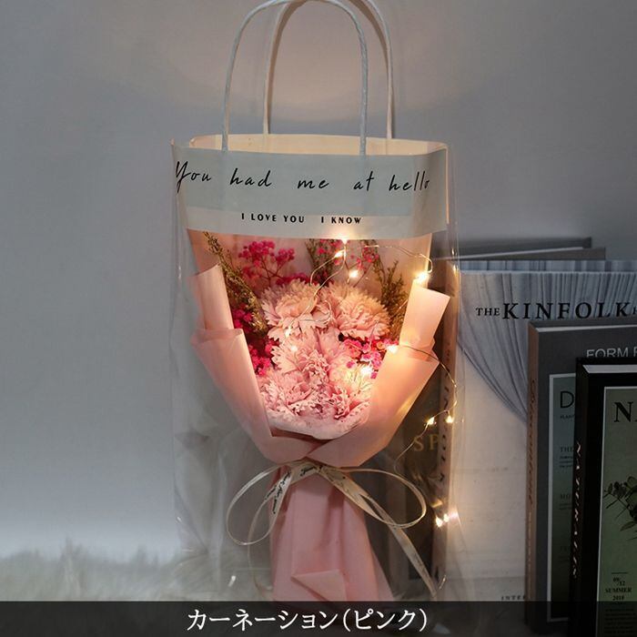 ソープフラワー 花束 手提げ袋付き カーネーション バラ LEDライト付き LED イルミネーションライト ブーケ フレグランスソープフラワー 枯れない花 花 造花 石鹸花 プレゼント ギフト 誕生日 贈り物 母の日 敬老の日 バレンタイン ホワイトデー 結婚記念日 退職祝い 送別会 結婚祝い 卒業祝い 入学祝い 開店祝い 引越し祝い 新築祝い お見舞い 就職祝い かわいい