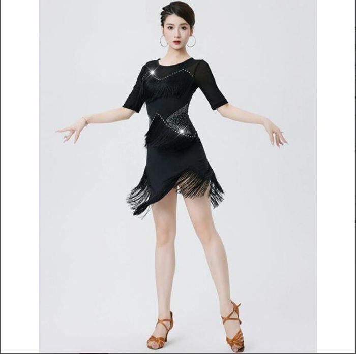 レディース ラテン ダンス ワンピース 半袖 ショート丈 ラテン ドレス フリンジ ラインストーン 揺れ揺れ キラキラ セクシー 社交ダンス モダンダンス 練習着 レッスン着 三角形裾 xzxiaoyun207