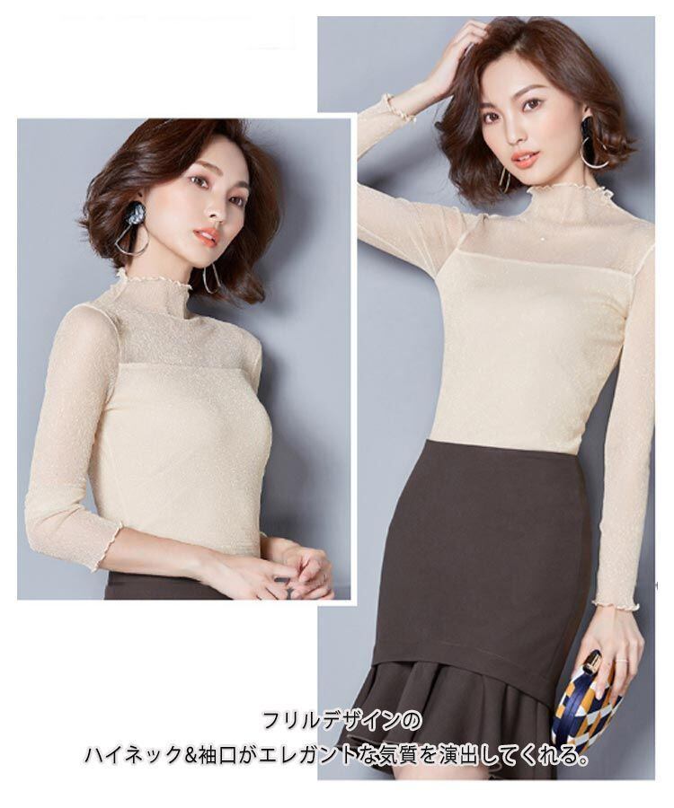 【M-XXXL】 キラキラ シアートップス レディース 春 秋 夏 長袖 シアー トップス ハイネック シースルー トップス 透け感 フリル 重ね着 レイヤード チュール 柄 インナー 薄手 裏起 パ#fff0048 | オキナ商店