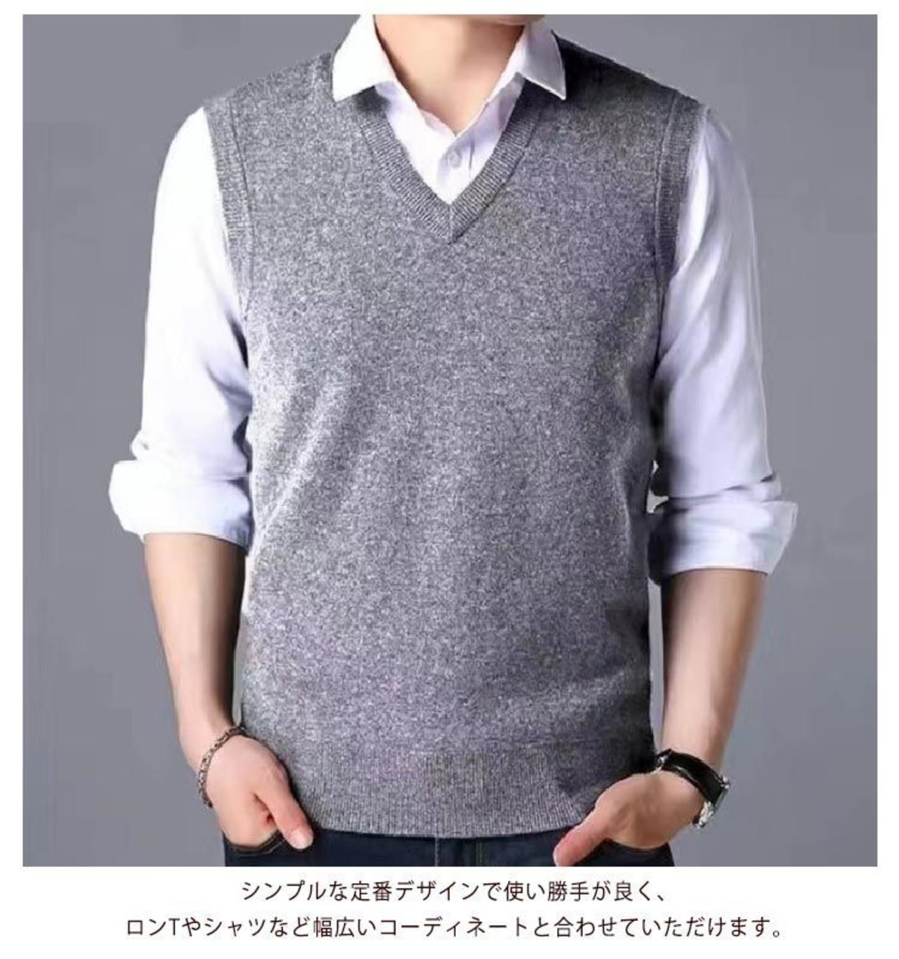 シンプルなVネックベストデザインで、カジュアルからオフィスまで幅広く対応。