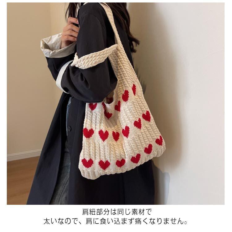 ニットバッグ トートバッグ 大きめ ハート柄 ケーブル編み レディース ショルダー 肩掛け 編みバッグ ニット 大容量 a4 軽量 バッグ かばん 鞄 サブバッグ お出かけ 旅行 軽い 通勤 通学 #sam727 | オキナ商店