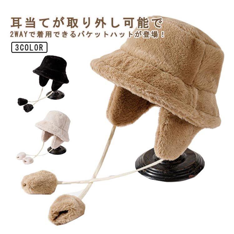 耳当て付き バケットハット イヤーマフ 2WAY 取り外し可 ファー バケットハット あたたかい 防寒 冬 もこもこ ふわふわ 帽子 レディース メンズ 秋冬 耳あて付き 紐 調節 フェイクファー ハ#sam740 | オキナ商店