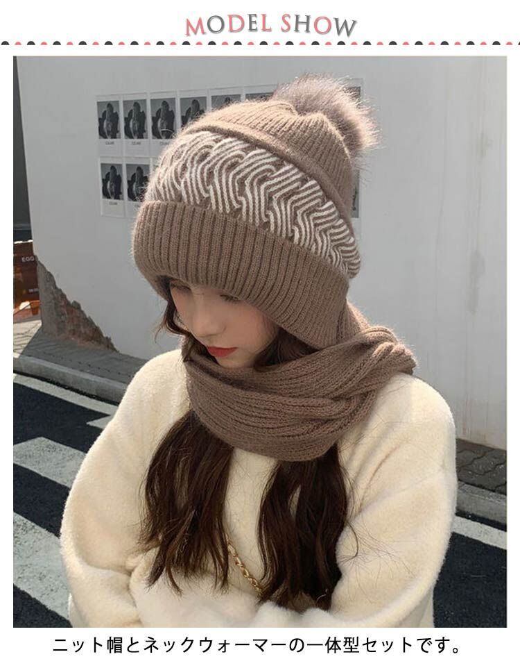 ニット帽 ニットキャップ レディース ポンポン付き 帽子マフラー一体 ケーブル編み キレイにかぶれる ネックウォーマー 大きいトップで耳まですっぽり プレゼント ゆったり レトロ 秋 冬 アウトドア #yz5645 | オキナ商店