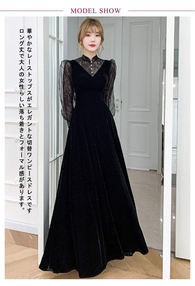 ワンピース 袖あり オケージョン ドレス パーティードレス お呼ばれ 透け感 レース レディース 二次会 結婚式 イブニングドレス ロング丈 韓国 秋冬 着痩せ aライン 体型カバー ぽっちゃり ロン#ikawa606549 | オキナ商店