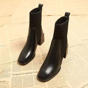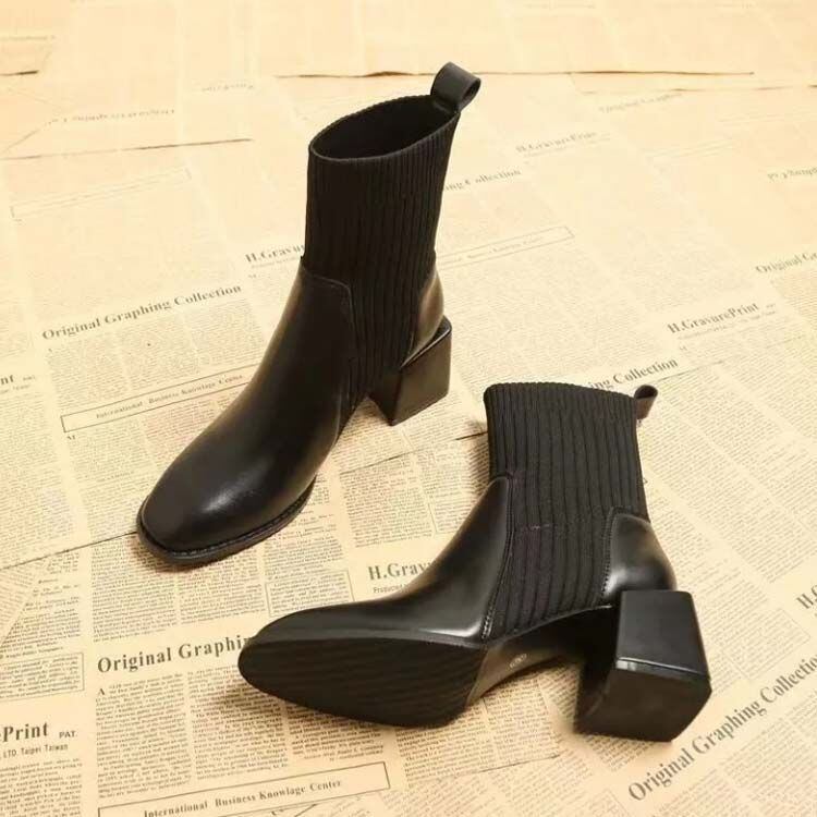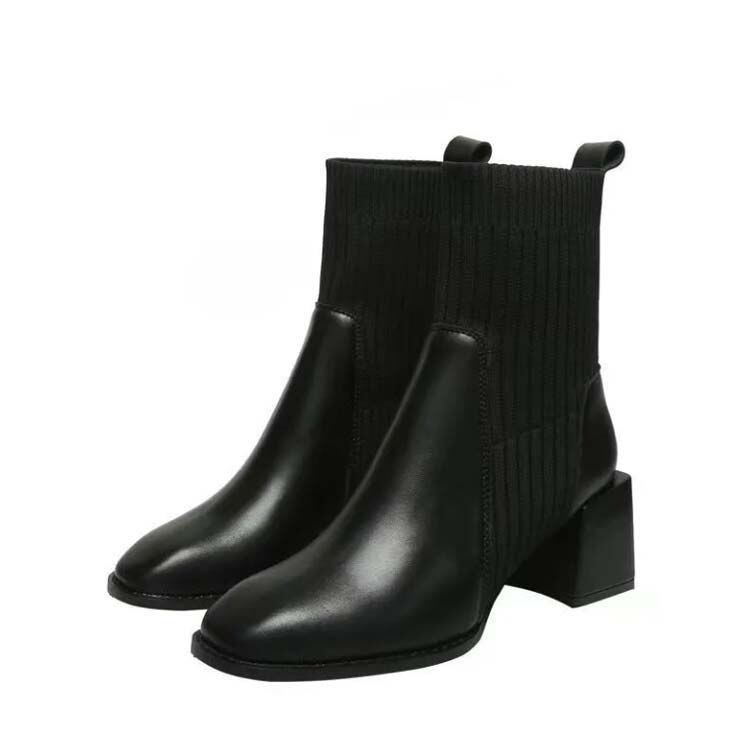 サイドニット チャンキーヒール ストレッチ リブ ミドルブーツ ミドルヒール リブニット 太ヒール ショート PUレザー ショートブーツ スクエアトゥ 通勤 ブーツ シューズ 長靴 伸縮性 美脚 フィ#yskma602986 | オキナ商店