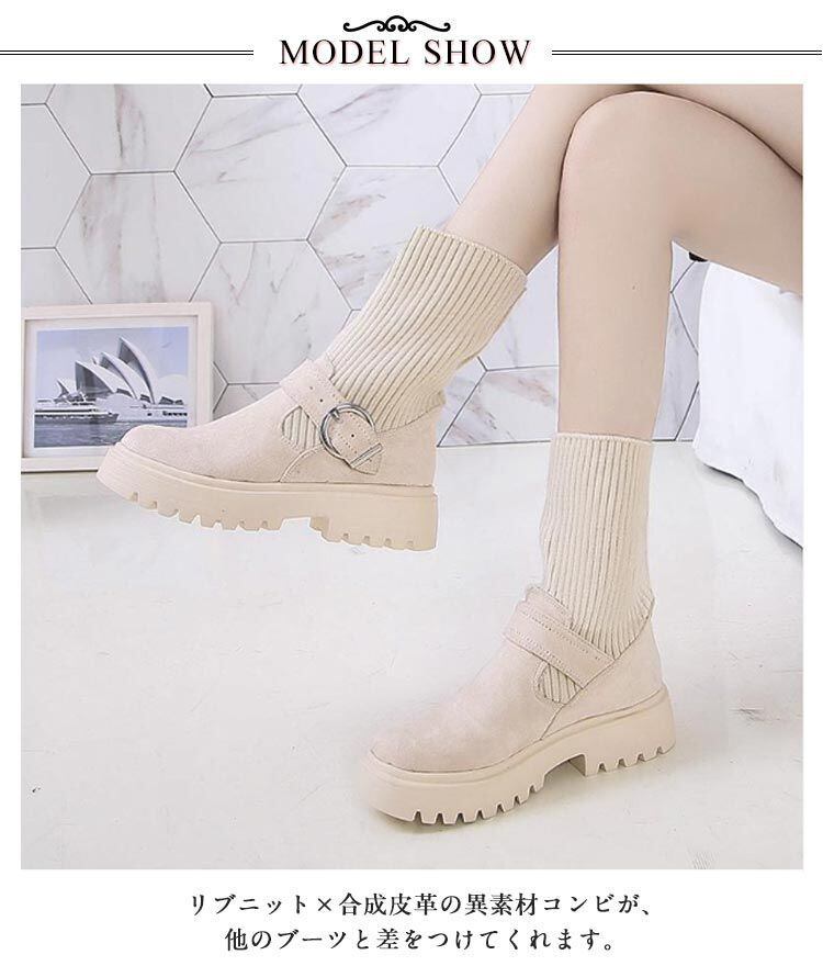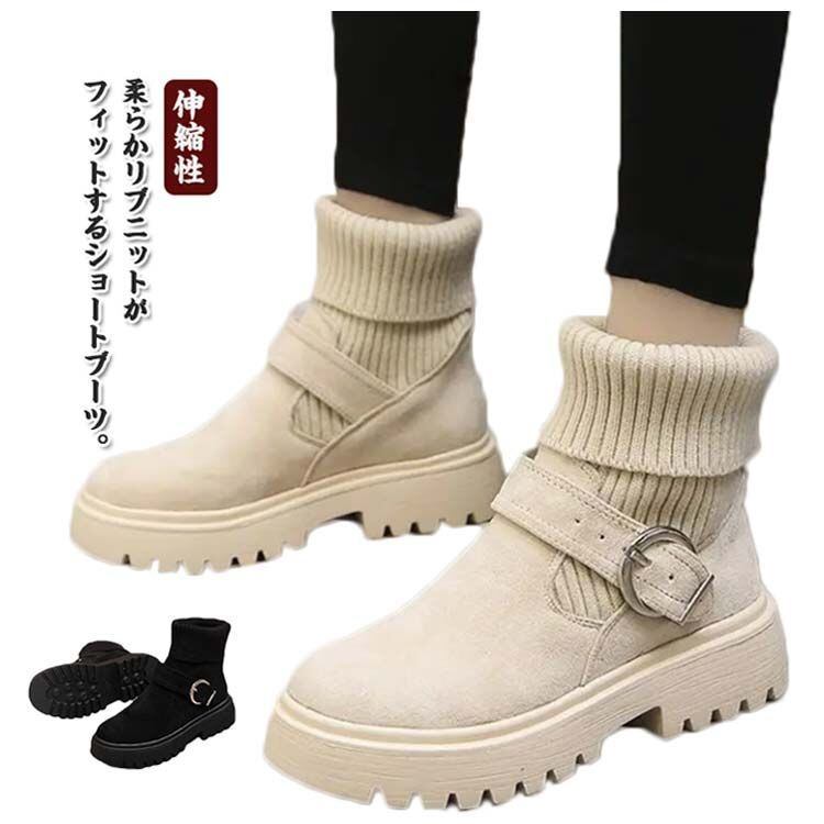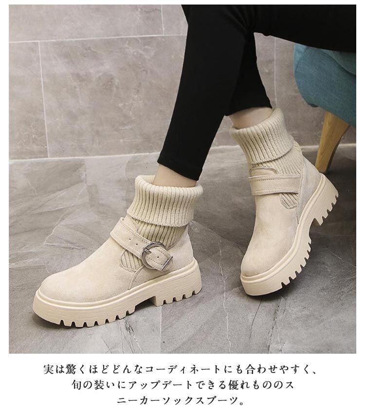 ショートブーツ ソックスブーツ レディース ショートブーツ 厚底 リブニット ソックスシューズ ブーツ ハーフ丈 ワークブーツ ミドルブーツ 厚底 ストレッチ 長靴 伸縮性 美脚 歩きやすい ベージュ#yskma602983 | オキナ商店