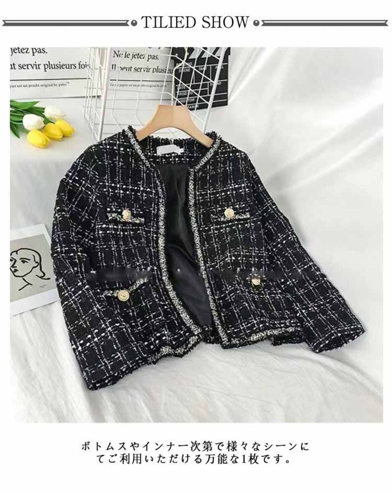 ツイードジャケット ノーカラ— チェック 大きいサイズ ツイード ジャケット ノーカラージャケット アウター レディース きれいめ トップス ママスーツ フォーマル 卒業式 入学式 スーツ ママ ブラ#jzxd1350 | オキナ商店