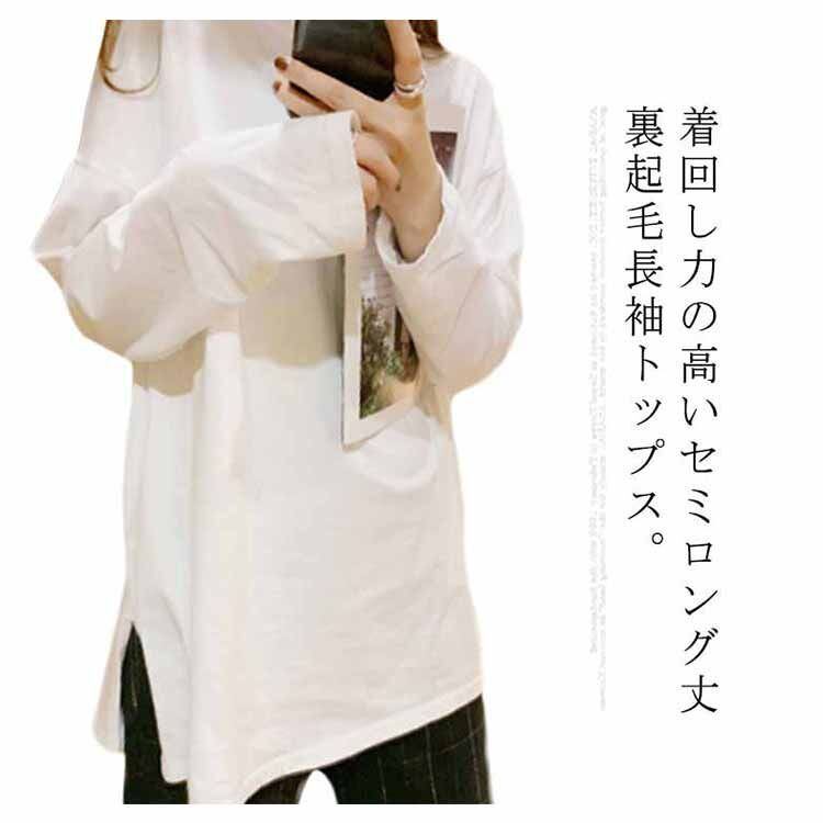 重ね着 インナー 長袖 レディース 裏起毛 柔らかい 保温 あったか レイヤード 裾 トップス カットソー Tシャツ ラウンドネック 厚手 無地 ゆったり セミロング 定番 サイドスリット ホワイト #lqc485 | オキナ商店