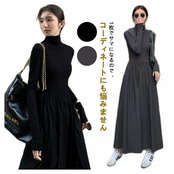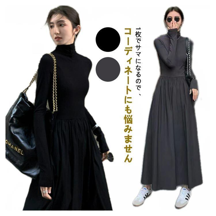 ワンピース レディース 長袖 タートルネック ロング丈 ハイネック ロングワンピース マキシ丈ワンピ ハイウエスト フレア ウエスト切替え Aライン 春 秋 冬 体型カバー 着痩せ おしゃれ シンプル#amyz2758 | オキナ商店