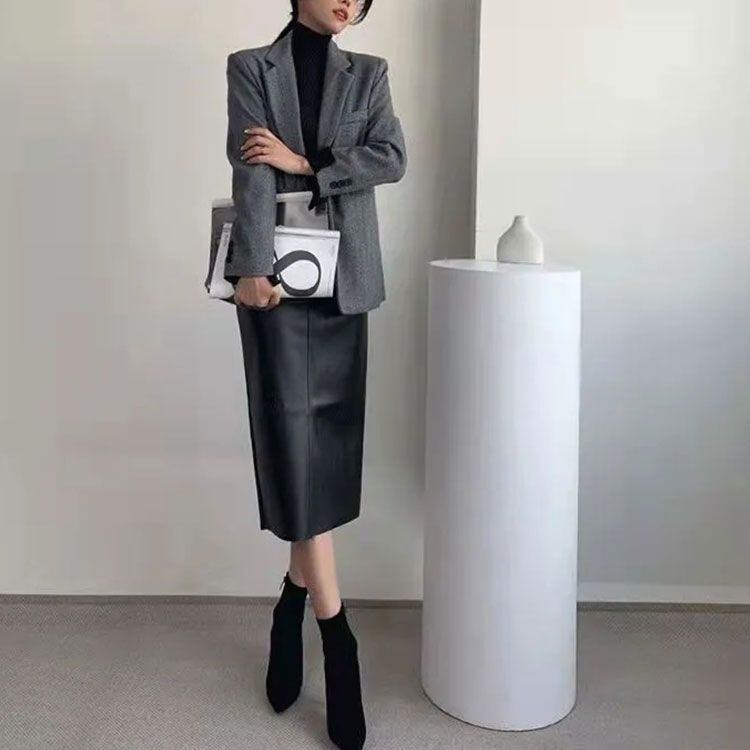 レザースカート スリット入り スカート ミディアムスカート バックスリット レザー フェイクレザー ペンシルスカート 秋冬 ロングスカート タイト 大人女子 フェイクレザー タイトスカート オフィス #lucky320 | オキナ商店