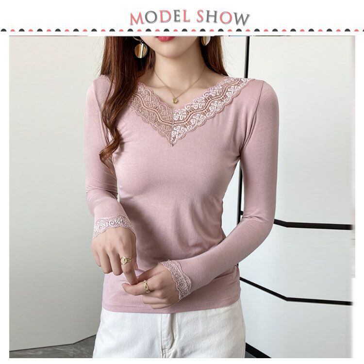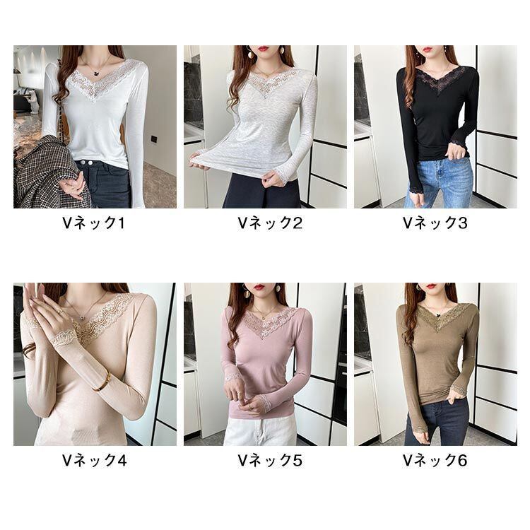 胸元 レース 長袖 インナー 選べる襟 トップス Vネック ラウンドネック カットソー 長袖 レディース きれいめ Tシャツ インナー 春 秋 冬 薄手 シンプル かわいい おしゃれ オフィス カジュ#nljydm0007 | オキナ商店