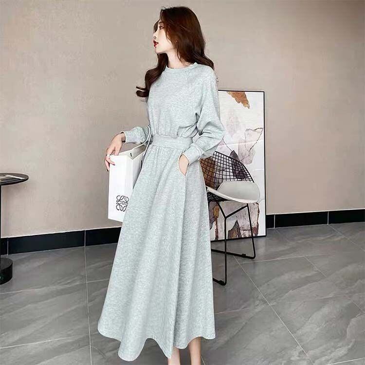 ワンピース 長袖 マキシ丈 スウェットワンピース ウエストシェイプ ハイウエスト ロング パーカーワンピース Aライン ポケット付き 丸首 脚が隠せる トレーナー スエット ワンピース 体型カバー 春#yojf1850 | オキナ商店