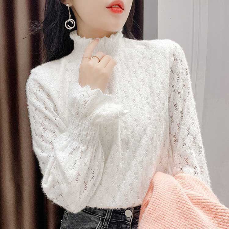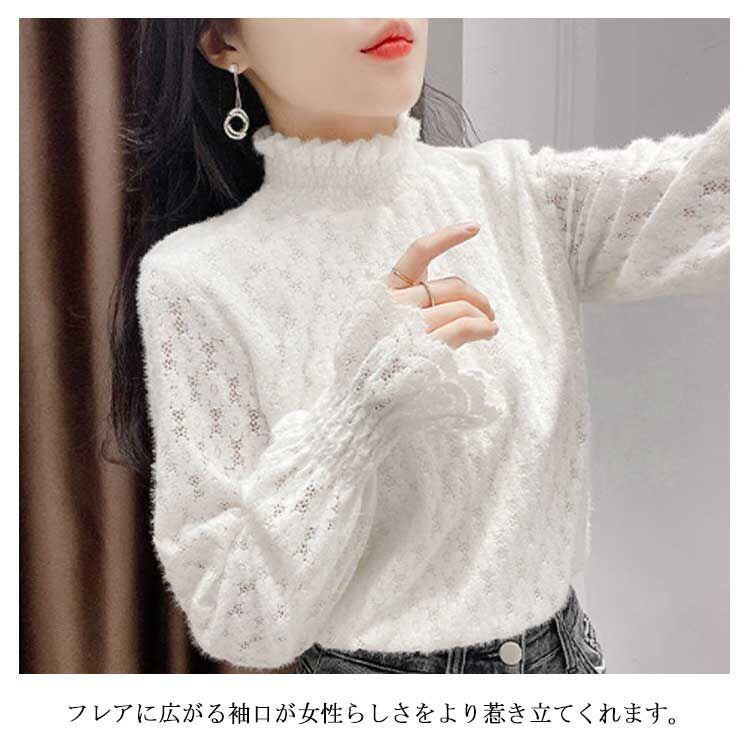 カットソー 総レース レディース 裏起毛 ブラウス 長袖 ハイネック タートルネック トップス 裏フリース インナー シースルー シャツ 立ち襟 フリル襟 花柄 フレア袖 透け感 無地 フォーマル #tim2319 | オキナ商店