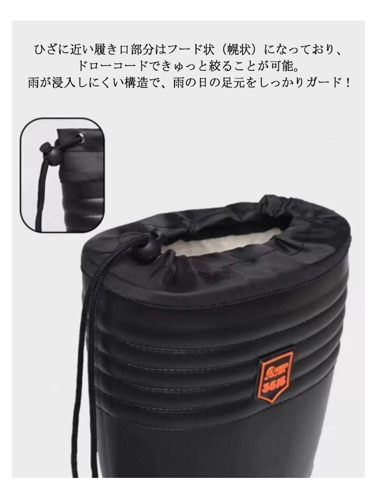 ・ひざに近い履き口部分はフード状(幌状)になっており、ドローコードできゅっと絞ることが可能。雨が浸入しにくい構造で、雨の日の足元をしっかりガード!