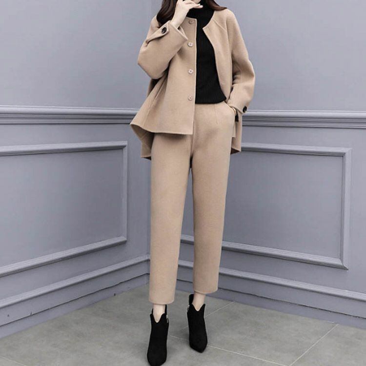フレア感のあるジャケットとノーカラーのシルエットが堅さが無くて柔らかく女性らしい印象に!